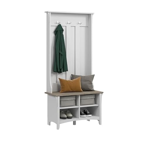 You can create your own makeshift “drop zone” with a cute bench and some wall hooks to hold backpacks and bags.